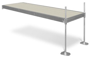 Simplified AssemblyPre-engineered components make installation a breeze. A 1/2″ wrench is the only tool needed for assembly. Dock sections are secured and adjusted for height with the turn of a bolt. 4′ x 4′ deck sections simply drop into place – no fasteners needed. For a streamlined appearance, poles may be cut flush or below the deck surface. |