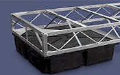 Bridged FrameworkThe Floating Dock incorporates engineering principles proven in bridge and crane construction. The open framework design provides maximum strength with minimum weight and creates less wave resistance for superior stability. Heavy-duty structural support tubes are used at both the top and bottom of the side frames. The entire frame is reinforced with structural channel bracing and extra strong angle crossbars. Corners are strengthened with extra large gussets. |