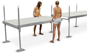Hewitt Sectional Dock Systems offer greater economy, quick setup and minimal maintenance. Frames and decking are preassembled in easy to handle modules. The aluminum sides wrap around the decking to maintain a crisp, clean appearance. Section ends may be dressed off with optional aluminum or cedar end caps. Hewitt Sectional Docks offer many layout possibilities and give you the choice of three different decking options.