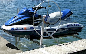 Dragging your personal watercraft or small boat across a rocky shore can ruin your hull (and your back). Hewitt has a better solution – single or double PWC lifts. Raise and lower your light craft without strain or damage. Capacities range from 900 lbs to 1800 lbs, and all models offer the benefits of all-aluminum construction – low weight, high strength and rust-free corrosion resistance. Standard features include horizontal crossbar reinforcement, self-braking winches with enclosed gears, durable acetal Delrin pulleys with stainless steel cable and adjustable pressure treated wood bunks, covered with marine carpeting.
